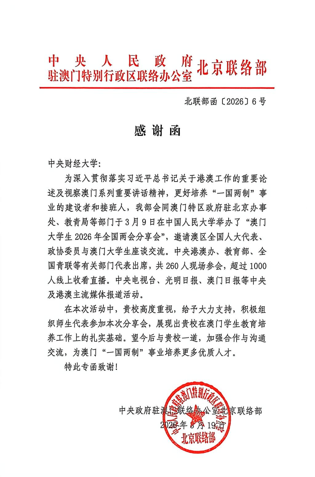 3月19日,中央人民政府驻澳门联络办公室北京联络部向我校发来感谢信,高度评价我校澳生培养工作,对我校积极组织优秀澳生代表参与本次活动表示感谢。
